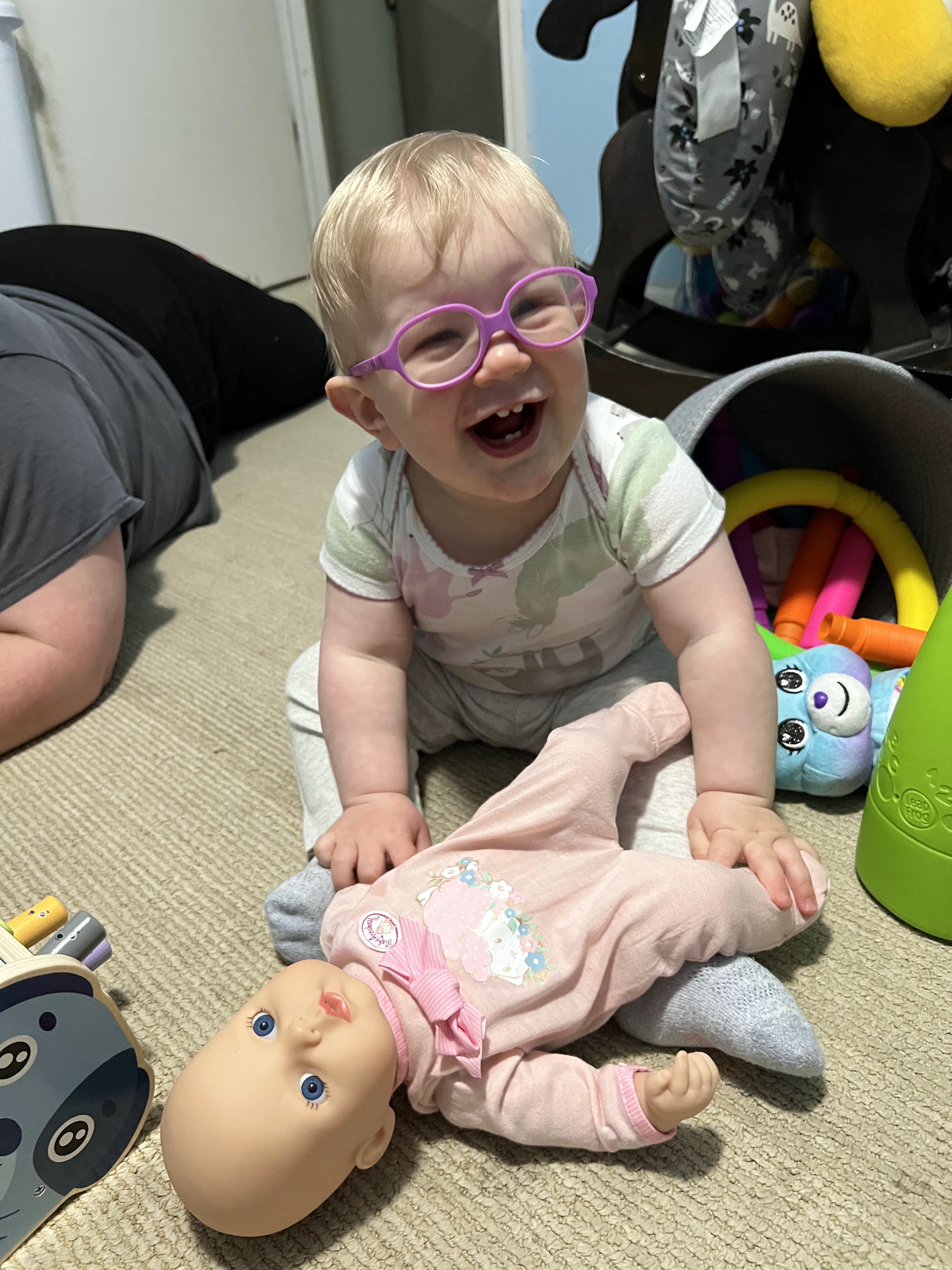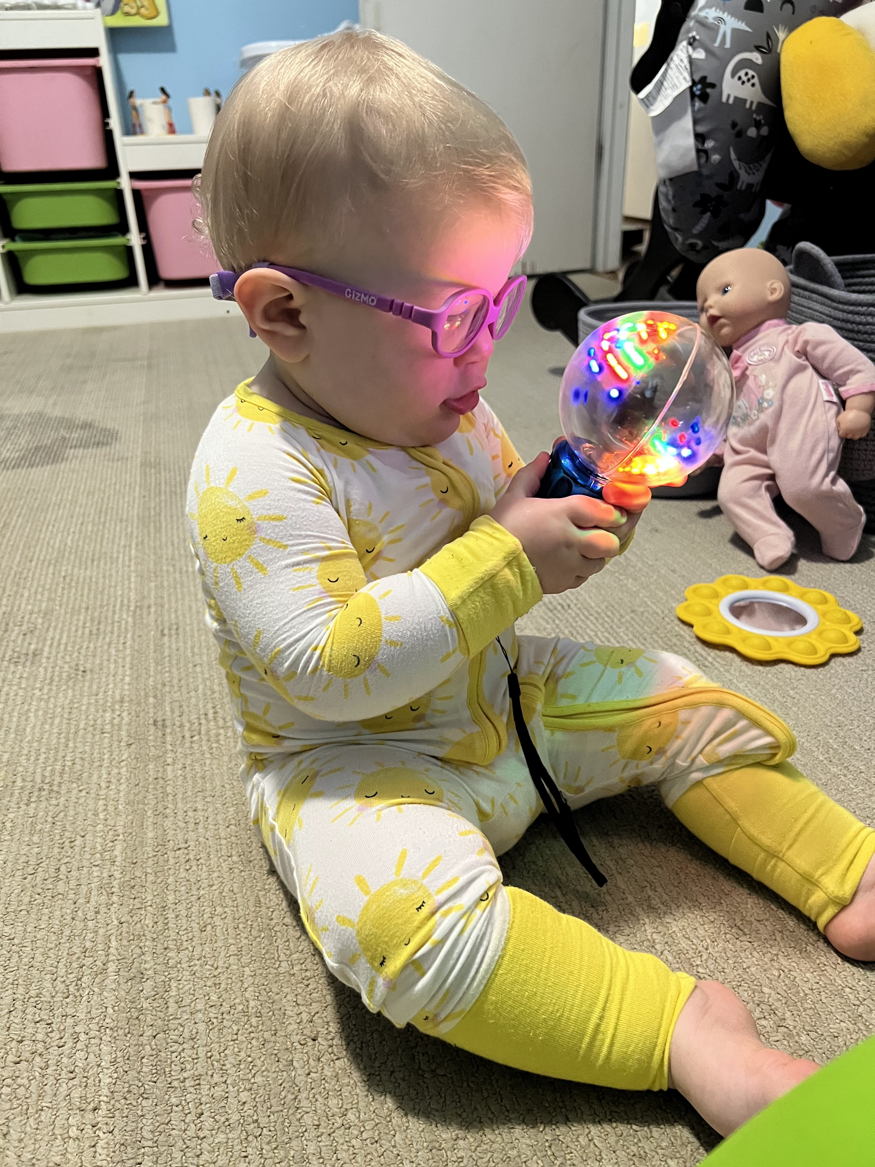 Speaking of eyes, Parker’s glasses seem to be making a huge difference with her vision. Most importantly, Parker is definitely using her right eye (the less effective one) more, gaining both depth perception and binocular vision. We can tell she can see more things in a room, mostly because she is now demanding things that she wants that previously she seemed to be unaware of! No remote, cellphone, or tablet now escapes her notice. She also is less startled by things also, indicating greater awareness of her environment. Parker had a meeting with a staff person from the local school for the visually impaired to get “on their radar” but also to get some advice about how to continue to help her develop her vision.