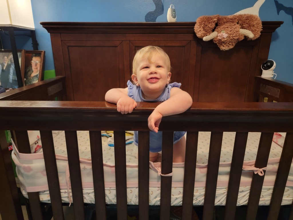 At the end of July, Parker reached a pretty huge milestone, which was obtaining the ability to pull herself up. So obviously we had to lower the crib (it only took almost until she was almost 18 months old). She still can’t get from knees to standing, but we figured we didn’t want her to discover that trick then immediately flip over the rail onto the floor, so no more waiting to move the crib from infant to toddler position. She was pretty proud of her accomplishment.